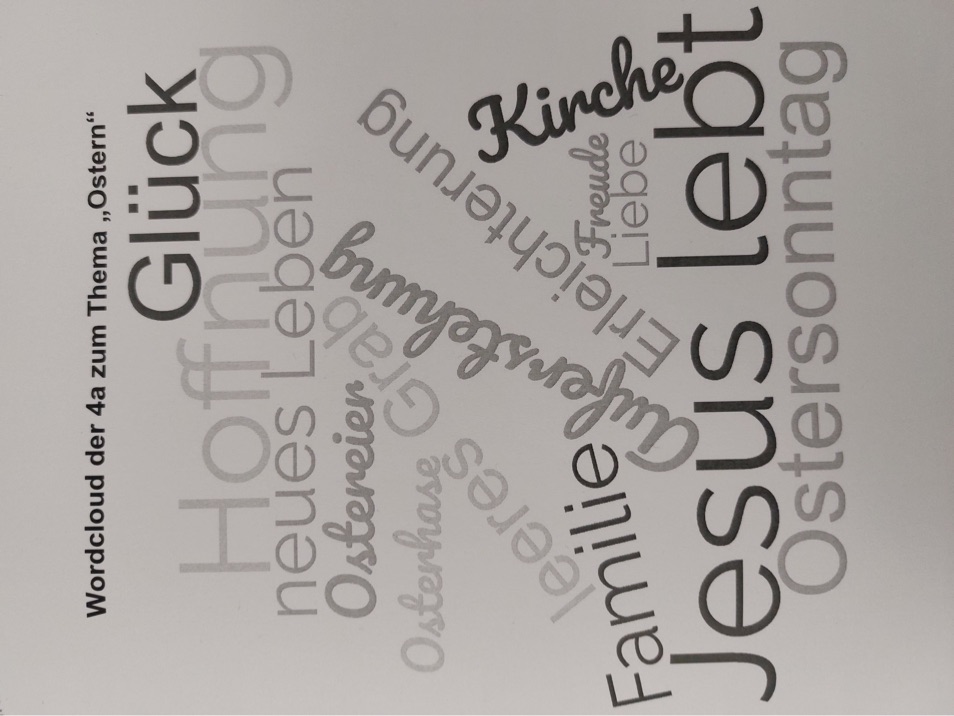 OSTERN ist mehr als das Fest der bunten Eier und des Osterhasen. Daher wurde im katholischen Religionsunterricht in den letzten Wochen vor Ostern gemeinsam mit den Kindern die biblischen Ursprünge der Ostertraditionen besprochen. Es wurden die Tage der heiligen Woche anhand der Bibelerzählungen gelegt, gespielt, gemalt, gebastelt und besungen. Der Palmsonntag wurde mit Playmobilfiguren und Holzklötzen gestaltet, bei Brot und „Wein“ wurde Abendmahl gefeiert. Schrittweise erarbeiteten sich die Erstklässler ein Osterbüchlein, das sie dann voller Stolz mit nach Hause nehmen durften. Mit jeder neuen Stunde wuchs ein gemeinsamer wunderschöner Osterweg, der dann kurz vor den Ferien von allen Klassen bestaunt wurde. Besonders das leere Grab zauberte vielen Kindern ein Lächeln ins Gesicht. Mit den Drittklässlern wurde über die Bedeutung der Ostersymbole und anschließend behutsam über das Leiden Jesu gesprochen. Die Viertklässler entwarfen mit ihren Ideen und Gedanken zu Ostern Wordclouds, die sie anschließend nach eigenen Ideen gestalteten.